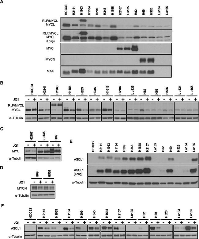 Figure 1: Expression of MYC family and ASCL1 proteins and their reduction by JQ1 in SCLC cell lines. The results of Western blot analysis in 14 cell lines using antibodies for MYCL, MYC, MYCN, MAX and ASCL1 are shown. A, E. Expression of MYC family, MAX and ASCL1 proteins in 14 SCLC cell lines. To demonstrate the presence of MYCL protein in all the cell lines and ASCL1 protein in 11 of the 14 cell lines examined, the images of longer exposures (Long) are also shown. B, C, D, F. Reduction of MYCL, MYC, MYCN and ASCL1 expression by JQ1 treatment in SCLC cell lines. Cells were cultured for 24 hours with JQ1 (+) or without JQ1 (-), and whole cell lysates were analyzed using antibodies for MYCL (B), MYC (C), MYCN (D), ASCL1 (F) and α-Tubulin. Membranes were then incubated with a peroxidase-conjugated antibody. Enhanced chemiluminescence was performed according to manufacturer’s instructions (Western Lighting Plus, Perkin Elmer).