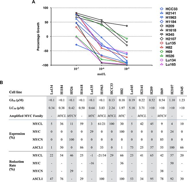 Figure 2: Effects of JQ1 on the growth and expression of MYCL, MYC, MYCN and ASCL1 proteins in SCLC cell lines. A. Concentration response curves for JQ1 in 14 SCLC cell lines are shown. Blue, red and green symbols represent MYCL, MYC and MYCN amplified cell lines, respectively, purple symbols represent MAX deleted cell lines, and black symbols represent MYC family non-amplified cell lines. B. Cell lines are ordered according to the sensitivity to JQ1. GI50 and LC50 were calculated as described previously [18]. Amplified MYC family genes are indicated. Levels of MYCL, MYC, MYCN and ASCL1 protein expression and its reduction rates were calculated based on the amount of each protein normalized to α-tubulin shown in Figure 1 and Supplementary Figure S2. The relative protein levels in each cell line are expressed by the percentage of the level in the cell line with the highest expression among the 14 cell lines.