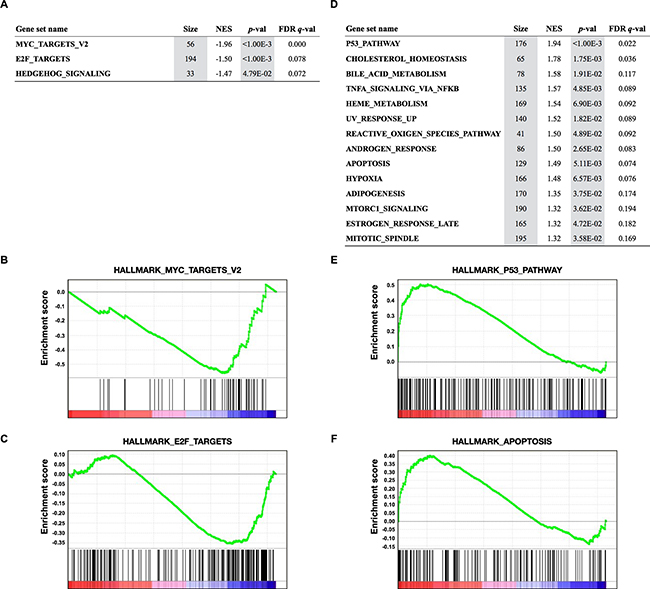 Figure 4: Gene Set Enrichment Analysis (GSEA) of transcriptional profiles in 12 SCLC cell lines treated with JQ1. A, D. Gene sets significantly enriched (p<0.05) among genes downregulated (A) and upregulated (D) by JQ1 in 12 SCLC cell lines with p-value, FDR q-value, the number of genes (Size), and the normalized enrichment score (NES). B, C, E, F. GSEA plots showing downregulation of MYC (B) and E2F targets (C), and upregulation of P53 (E) and apoptosis (F) pathways.