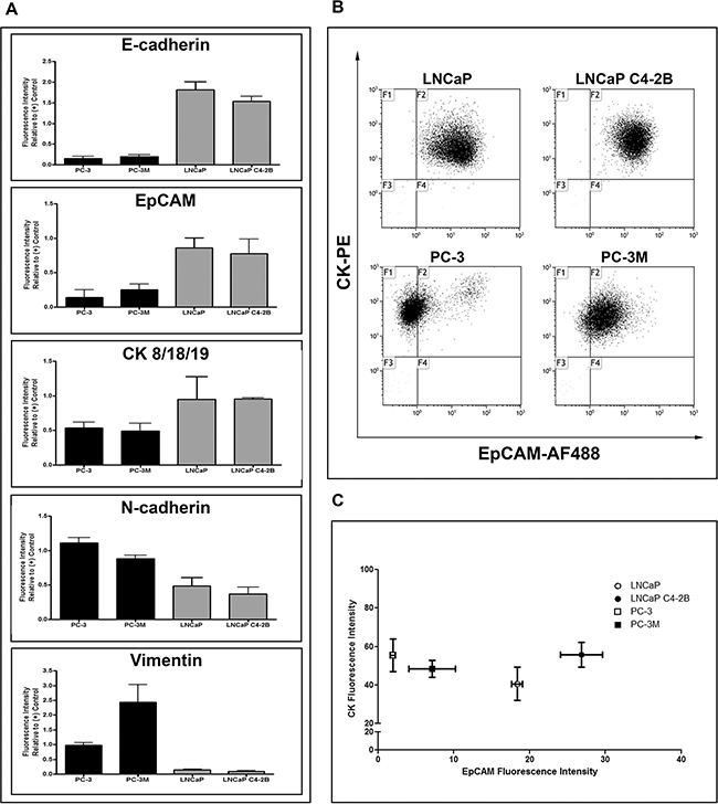 Figure 1: Human prostate cancer cell lines display differences in EMT phenotype. A. Protein expression analysis by flow cytometry for the epithelial-associated markers E-cadherin and EpCAM and the mesenchymal-associated markers N-cadherin and vimentin in PC-3M, PC-3, LNCaP C4-2B, and LNCaP human prostate cancer cells. Data are presented as relative fluorescence intensity (expression) compared to appropriate positive control cell lines (E-cadherin/EpCAM/CK: MDA-MB-468; N-cadherin/vimentin: HeLa) (n=3). The expression of epithelial-associated and mesenchymal-associated proteins corresponds to previously reported cell aggressiveness and in vivo metastatic capacity of these cell lines. B. Flow cytometry dot plots of the differential expression of EpCAM (AF488) and CK8/18/19 (PE) in investigated prostate cancer cell lines. C. Flow cytometry analysis for co-expression of EpCAM and CK8/18/19, presented as the mean ± SEM fluorescence intensity of the investigated proteins for each cell line (n=3).