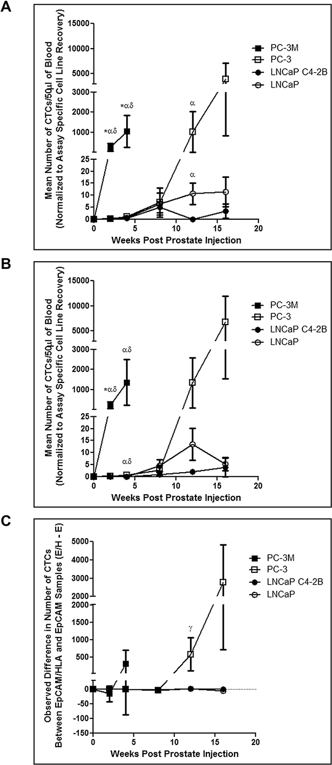Figure 2: Human prostate cancer cell lines with an increasingly mesenchymal phenotype shed greater numbers of CTCs more quickly and have an enhanced in vivo capacity for shedding CTCs that are undetectable by the CellSearch® system. PC-3M, PC-3, LNCaP C4-2B, and LNCaP human prostate cancer cells were orthotopically injected into 6-8 week old male nude mice via the right dorsolateral lobe of the prostate (1×106 cells/mouse) to assess spontaneous metastasis. At several timepoints post injection (2, 4, 8, 12, and 16 weeks) mice were sacrificed and blood (100μl) was collected and processed using both the A. EMT-dependent and B. EMT semi-independent assays (50μl/assay) to assess differences in CTC recovery. Data are presented as the mean ± SEM (n=5-12 mice/group). C. Comparison of the observed difference in the number of CTCs detected using the EMT-dependent and EMT semi-independent assays in matched samples. Data are presented as the mean (± SEM) difference in the number of observed CTCs between both assays (# captured by EpCAM/HLA assay - # captured by EpCAM assay) at a given timepoint (n=5-12 mice/group). Positive values represent groups in which more CTCs were detected with the EMT semi-independent assay, whereas negative values represent groups in which more CTCs were detected with the EMT-dependent assay. Differences in the mean number of CTCs between cell lines at a given timepoint using and differences between each assay within individual mice was assessed using Wilcoxon Scores followed by a Kruskal-Wallis test at each timepoint. Comparison of differences between each assay in matched data sets within cell lines at a given timepoint was performed using a Wilcoxon matched-pairs signed rank test. * = significant difference relative to PC-3; α = significant difference relative to LNCaP C4-2B; δ = significant difference relative to LNCaP; γ = overall significant difference (unable to perform pairwise comparison) (p≤0.05).