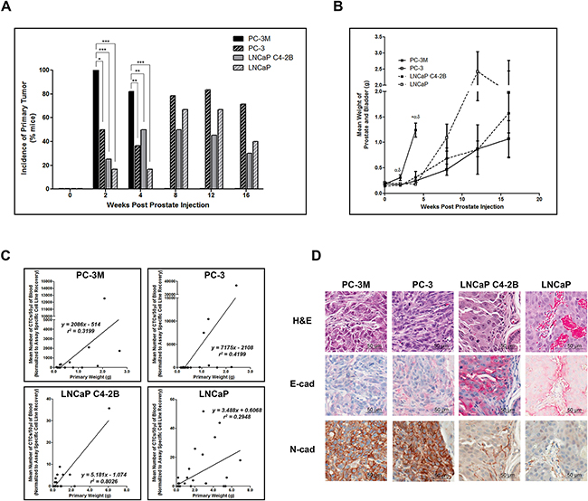 To determine differences in the extent of disease and metastatic spread across the 4 cells lines, at necropsy, animals were assessed for primary tumor incidence/weight, and metastatic spread to lymph nodes and distant metastatic sites (lung, liver, bone). We observed that primary tumor incidence and size was significantly increased in highly mesenchymal PC-3M compared to all other cell lines (p≤0.05), except when considering tumor weight of PC-3 at 2 weeks (Figure 3A, 3B). All other cell lines showed comparable primary tumor incidence and weight at all timepoints. Additionally, primary tumor weight and the number of CTCs shed into the circulation (EMT-semi-independent assay) were positively correlated for all cell lines (Figure 3C). Immunohistochemical analysis of E-cadherin/N-cadherin revealed that all cell lines demonstrated comparable epithelial/mesenchymal phenotypes in vivo relative to those seen in vitro (Figure 3D, Supplementary Figure S4A).