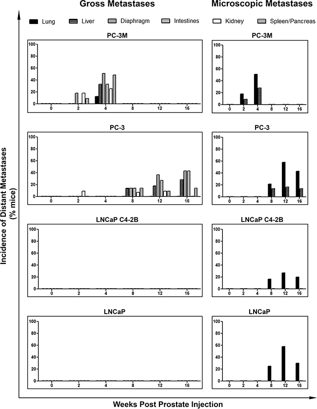 Figure 4: Human prostate cancer cell lines with an increasingly mesenchymal phenotype have an enhanced in vivo capacity for metastasis to distant organs. Incidence of metastasis to distant organs following orthotopic injection of PC-3M, PC-3, LNCaP C4-2B, and LNCaP human prostate cancer cell lines. Data are presented as the percentage of mice per cell line per timepoint with detectable distant metastases to the lung, liver diaphragm, intestines, kidney, and/or spleen/pancreas (n=7-39 mice/group) as assessed by gross observation at necropsy (left panel) and microscopic histological examination (right panel) of tissues.