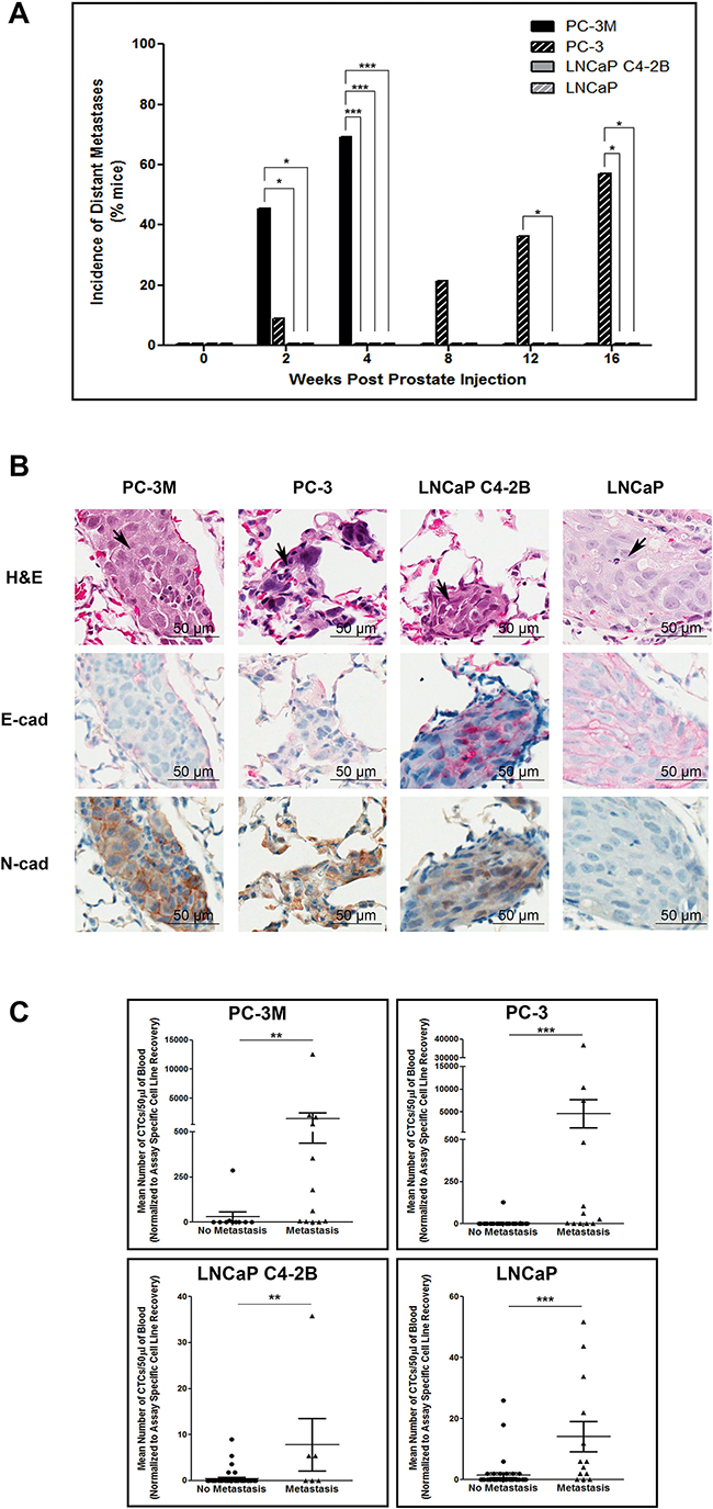 Differences in distant metastasis were investigated by gross assessment at necropsy and microscopic assessment following H&E staining. We observed that both PC-3M and PC-3 could disseminate to and establish gross macrometastases in a number of distant organs, while no visible macrometastases were observed at necropsy in mice injected with either LNCaP or C4-2B (Figure 4). However, microscopy analysis of lung and liver revealed distant metastases to these organs for all of the investigated cell lines. Analysis of the incidence of gross metastatic disease demonstrated that more mesenchymal PC-3M and PC-3 had significantly increased metastatic capacity versus more epithelial LNCaP and C4-2B (p≤0.05) (Figure 5A). Representative H&E and IHC analysis of lung metastases are shown in Figure 5B and Supplementary Figure S4C. Additionally, the number of CTCs was significantly higher across all cell lines in mice with metastatic disease relative to those without (p≤0.05) (Figure 5C), and in those cell lines with the greatest metastatic capacity, thus demonstrating the relationship between CTCs and metastatic spread.