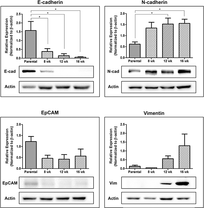 Figure 6: Circulating tumor cells acquire a more mesenchymal phenotype during disease progression. Following orthotopic injection of PC-3 prostate cancer cells into the right dorsolateral lobe of the prostate (1 × 106 cells/mouse) blood collected at 8 weeks, 12 weeks, and 16 weeks post-injection was lysed with sterile 1x NH4Cl, washed with PBS, and plated for tissue culture. Following 1-2 weeks of growth, with regular media changes to remove contaminating blood cells, the remaining CTCs were assessed using immunoblot for the expression of the epithelial-associated markers E-cadherin and EpCAM and the mesenchymal-associated markers N-cadherin and vimentin. Results are presented in quantitative densitometric form normalized to β-actin and as representative immunoblots, shown as cropped gel images (n=3). Changes in EMT gene expression were compared to the parental cell line using 1-way ANOVA with Dunnett’s post-test for multiple comparisons. * = significantly different than parental line (p≤0.05).