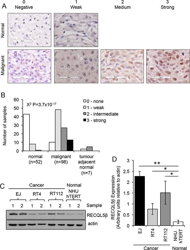 Figure 1: RECQL5 protein expression is increased in UCC. A. Tissue microarray stained for RECQL5β and scored on a scale of 0-3 depending on whether the nuclear staining was negative, weak, medium, or strong respectively. Examples of normal and malignant tissue in each category are shown. None of the normal samples had medium or strong staining. B. Quantification of staining and statistical significance calculated using Contingency Table Pearson Chi-square test. C. Western blot for RECQL5β in normal immortalised bladder (NHU hTERT) and UCC (EJ, RT4, and RT112) cells; 2 successive passages of the cells are shown. D. Quantification of western blots average and standard deviation of 4 biological repeats is shown, * and ** indicate p<0.05 and p<0.01 respectively using Students t-test.