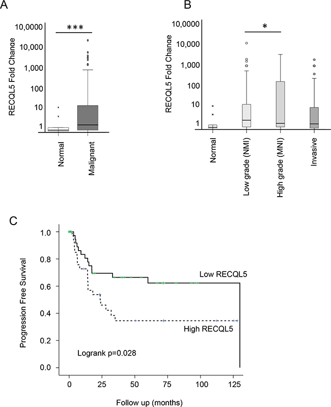 Figure 2: RECQL5 mRNA is increased in UCC and is associated with poor prognosis. Taqman qRT-PCR quantification of mRNA from 197 primary bladder tumour and 20 normal tissue samples using a RECQL5 probe and plotted as fold change [52]. A. Stratified by normal compared to malignant tissue and B. according to tumour grade; * and *** indicate p<0.05 and p<0.001 respectively using Students t-test C. Kaplan Meier curve showing progression free survival based on RECQL5 mRNA expression, p value calculated as log-rank score.