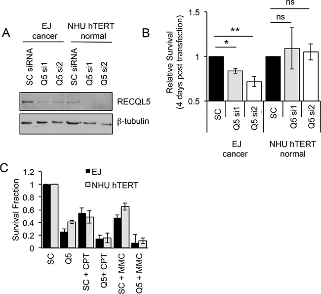 Figure 3: Depletion of RECQL5 reduces survival in bladder cancer cells. A. Western blot for RECQL5β of UCC (EJ) and immortalised normal bladder (NHU hTERT) cells depleted of RECQL5 using siRNA against RECQL5β specifically (Q5 si1) or all 3 isoforms of RECQL5 (Q5 si2) compared to cells treated with non-targeting control (SC) siRNA. B. Survival fraction of corresponding RECQL5 depleted cells 96 h post siRNA transfection. C. Survival fraction of siRNA treated cells treated with or without 25 nM camptothecin (CPT) or 100 nM mitomycin C (MMC). Average and standard deviation of at least 3 experiments is shown, * and ** indicate p<0.05 and p<0.01 respectively using Students t-test, ns = not significant.
