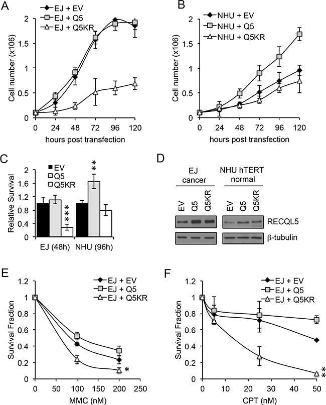 Figure 4: Exogenous expression of RECQL5β increases proliferation in normal bladder cells and expression of helicase dead RECQL5. A and C. Normal immortalised bladder (NHU hTERT) cells and UCC (EJ) cells transiently transfected with empty vector (MOCK), wildtype RECQL5β (Q5) or helicase dead RECQL5β (Q5KR) and western blotted for RECQL5β. B and D. Cell number in each of the transfected conditions after 24, 48, 72, 96 and 120 h. Average and standard deviation of 3 independent repeats is shown. Significance was calculated using a student’s t-test, ***indicates p<0.001 comparing MOCK to Q5KR transfected EJ cells at 120 h post-transfection and **indicates p<0.01 comparing MOCK to Q5 transfected NHU hTERT cells at 120 h. E and F. Clonogenic survival fraction of EJ cells treated as above for 48 h then replated into mitomycin C (MMC) or camptothecin (CPT). Average and standard deviation of 3 independent repeats is shown. Significance was calculated using a student’s t-test, **indicates p<0.01 and *indicates p<0.05 comparing Q5 to Q5KR transfected EJ cells.
