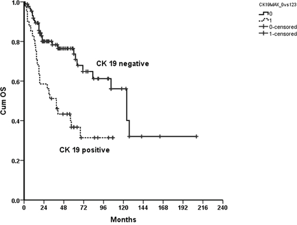 There is still a significant difference in OS between patients with positive and negative CK19 immunoreactivity, after adjustment for demographic (age, smoking and alcohol) and known prognostic factors (pT, pN, tumor grading) (p=.010, Exp(B)=2.0349, 95% CI 1.231-4.482).