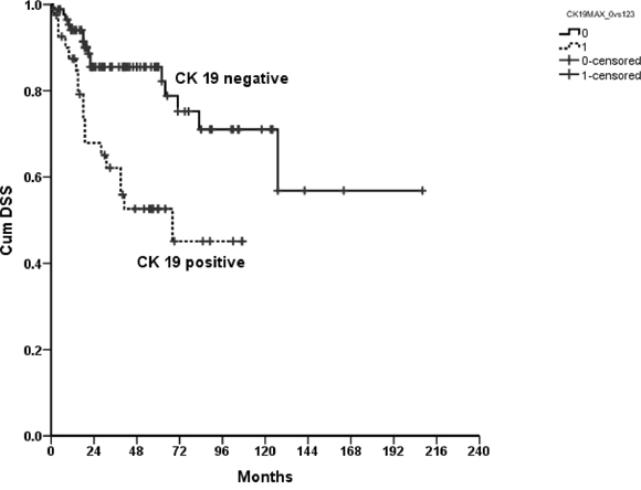 Figure 2: Kaplan Meier curve showing a statistically significantly improved disease specific survival for patients with negative compared to positive CK19 immunoreactivity of their tumors; p=0.001.