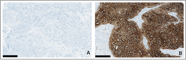 Figure 3: A–B. Expression of Cytokeratin 19 in oral squamous cell carcinoma: (A) immunohistochemical staining for CK19 with negative tumor tissue versus (B) strong positivity in other representative samples of malignant tumors, surrounding stromal tissue remains unstained. Scale bar = 100 μm.