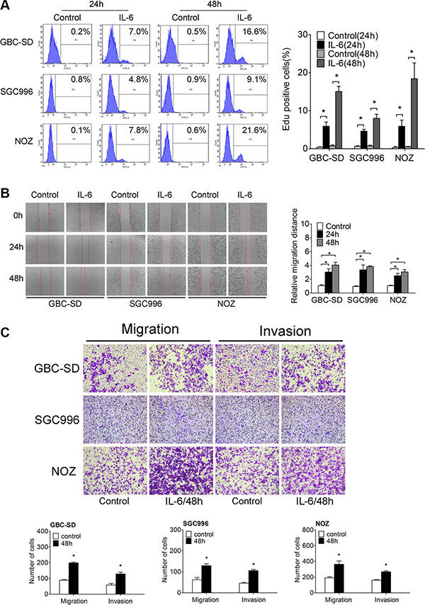 Figure 1: IL-6 promotes proliferation, migration and invasion of GBC in vitro. (A) Flow cytometry analyzed the Edu positive cells after IL-6 treatment (Left panel). Quantitative analysis of percentage of Edu positive cells (Right panel), *P < 0.05. The results are shown as mean ± S.D. (B) The wound-healing assay of GBC cells after IL-6 treatment (Left panel). Quantitative analysis of migration distance (Right panel), *P < 0.05. The results are shown as mean ± S.D. (C) The transwell migration and invasion assay of GBC cells after IL-6 treatment (upper panel). Quantitative analysis of migrated cells (lower three panels), *P < 0.05. The results are shown as mean ± S.D.