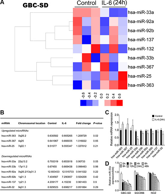 Figure 4: miRNA profilings of IL-6 treated cells and validation of microarray data using qRT-PCR. (A) Heatmap of miRNAs that targeted Twist clustered in IL-6 treated cells and control (red represents increased expression and blue represents decreased expression). (B) The list of changed miRNAs that targeted Twist identified in IL-6 treated cells. (C) Validation of miRNAs expression 24 h after IL-6 treatment using qRT-PCR, *P < 0.05. The results are shown as mean ± S.D. (D) Validation of miR-33a expression after IL-6 treatment using qRT-PCR, *P < 0.05. The results are shown as mean ± S.D.