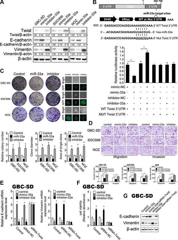 Figure 5: MiR-33a inhibits metastasis of GBC by targeting Twist in vitro. (A) The effect of mimic-33a, inhibitor-33a, or their negative controls on Twist, E-cadherin and Vimentin protein levels in GBC cells detected by western blotting. (B) A schematic diagram illustrating the design of luciferase reporters with the WT Twist 3′UTR (WT 3′UTR) or the site-directed mutant Twist 3′UTR (MUT 3′UTR) (upper panel). The effect of miR-33a mimic, inhibitor, or their negative controls on the luciferase activity of WT Twist 3′UTR or MUT Twist 3′UTR reporter in GBC cells (lower panel) , *P < 0.05. The results are shown as mean ± S.D. (C) The colony formation assays and GFP expression (left lower panel) in GBC cells transfected with control, pcDNA6.2-miR-33a, or pcDNA6.2-miR-33a inhibitor. Quantitative analysis of colony number, clone diameter and area of single clone (right three panels), *P < 0.05. The results are shown as mean ± S.D. (D) The effect of mimic-33a, inhibitor-33a, or their negative controls on migration and invasion in GBC cells. Quantitative analysis of migrated cells (lower three panels), *P < 0.05. The results are shown as mean ± S.D. (E) qRT-PCR analysis of E-cadherin and Vimentin mRNA levels in GBC cells after cotransfected siRNA-Twist with mimic-33a, inhibitor-33a, or their corresponding negative controls, *P < 0.05. The results are shown as mean ± S.D. (F) CCK-8 assay to detect cell viability in GBC cells after cotransfected siRNA-Twist with mimic-33a, inhibitor-33a, or their corresponding negative controls, *P < 0.05. The results are shown as mean ± S.D. (G) Western blotting analysis of E-cadherin and Vimentin protein levels in GBC cells after cotransfected siRNA-Twist with mimic-33a, inhibitor-33a, or their corresponding negative controls. CDS, coding sequence; NC, negative control.