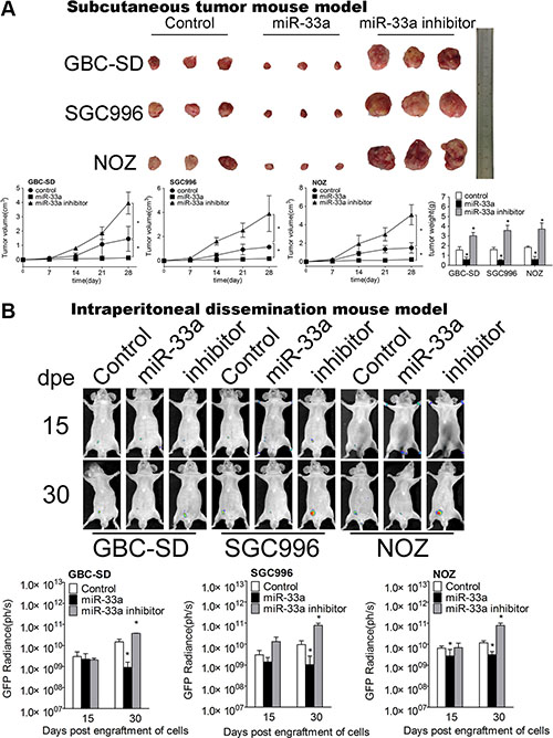 Figure 6: miR-33a inhibits metastasis of GBC in vivo. (A) Mice bearing GBC subcutaneous tumor models after transfection of control, pcDNA6.2-miR-33a, or pcDNA6.2-miR-33a inhibitor (n = 6 for each group). The lower panel shows the volume and weight of the tumors, *P < 0.05. The results are shown as mean ± S.D. (B) The expression of GFP (right three panels) in mice intraperitoneal dissemination models of GBC-SD, SGC996 and NOZ cells transfected with control, pcDNA6.2-miR-33a, or pcDNA6.2-miR-33a inhibitor. dpe, days post engraftment (n = 6 for each group). The results are shown as mean ± S.D.