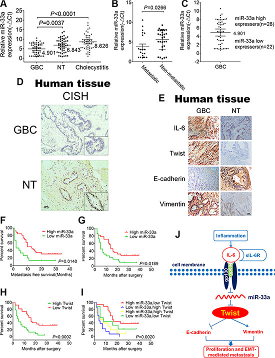 Figure 7: Correlations of miR-33a and pathological characteristics of GBC patients. (A) The expression of miR-33a in GBC tissues, adjacent normal tissues and cholecystitis tissues. The results are shown as mean ± S.D. (B) The expression of miR-33a expression in patients with or without metastasis. The results are shown as mean ± S.D. (C) The GBC samples were divided into two groups according to the mean expression of miR-33a. Cases with levels of miR-33a below the mean were miR-33a low expressers (n = 22), and those with levels of miR-33a above the mean were miR-33a high expressers (n = 28). The results are shown as mean ± S.D. (D) In situ hybridization to measure the expression of miR-33a in GBC tissues and adjacent normal tissues. (E) Representative IL-6, Twist, E-cadherin, and Vimentin expression in GBC tissues and adjacent normal tissues (×200). (F) Kaplan–Meier curves for metastasis-free survival of GBC patients between high and low miR-33a expression groups. (G) Kaplan–Meier survival curve for GBC patients between high and low miR-33a expression groups. (H) Kaplan–Meier curves for GBC patients between high and low Twist expression groups. (I) Kaplan–Meier curves for GBC patients between the high miR-33a/low Twist expression group and the low miR-33a/high Twist expression group. A p value was generated from all groups together. (J) Schematic representation of the function and potential mechanism of miR-33a in GBC. NT, normal tissues.