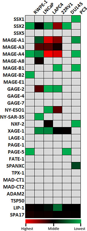 Figure 1: Quantitative analysis of baseline expression of cancer/testis antigen mRNA in 5 PC cell lines and in the RWPE-1 normal epithelial cell line. RNA was evaluated by qRT-PCR for expression relative to an internal control transcript (P0). qRT-PCR was performed using primers specific for each gene, conducted in triplicate, and repeated in an independent experiment. Expression relative to P0 was color scaled from red (highest) to black (middle) to green (lowest). Grey indicates that no relevant expression was detected.