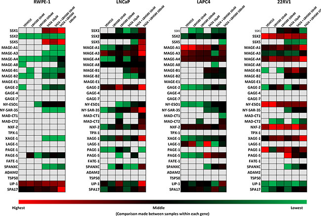 Figure 2: Quantitative analysis of relative expression of CTA mRNA in androgen-receptor expressing PC cell lines and in RWPE-1 normal epithelial cells in response to EMA treatment. RNA was evaluated by qRT-PCR for expression relative to an internal control transcript (P0) following EMA treatment of RWPE-1, LNCaP, LAPC4, and 22rv1 cells. qRT-PCR was performed using primers specific for each gene, conducted in triplicate, and repeated in an independent experiment. Expression relative to P0 was color scaled from red (highest) to black (middle; 50th percentile) to green (lowest) for each CTA separately, across all cell lines, thus similar colors between different rows cannot be directly compared. Grey indicates that no relevant expression was detected.