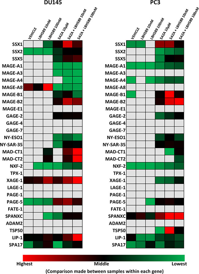 Figure 3: Quantitative analysis of relative expression of CTA mRNA in androgen-independent PC cell lines treated with EMAs. RNA was evaluated by qRT-PCR for expression relative to an internal control transcript (P0) following EMA treatment of DU-145 and PC3 cells. qRT-PCR was performed using primers specific for each gene, conducted in triplicate, and repeated in an independent experiment. Expression relative to P0 was color scaled from red (highest) to black (middle; 50th percentile) to green (lowest) for each CTA separately, across all cell lines, thus similar colors between different rows cannot be directly compared. Grey indicates that no relevant expression was detected.
