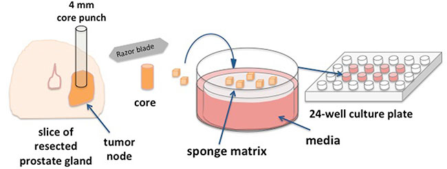 Figure 4: Ex vivo human prostate tissue drug culture. A novel preclinical model developed to test the effect of EMA agents on prostate tumor tissue collected from patients undergoing radical prostatectomy. Resected prostate gland slices are subject to gross pathology examination. 4 mm cores are punched from visible tumor nodes and tissue is sliced into ~1 mm3 pieces. Surgical gelatin sponge is soaked in supplemented Ham’s media and placed in 24-well tissue cultures wells. Tissue slices are carefully layered on the surface of saturated sponge matrix. The matrix is fully saturated by but is not submerged in media.