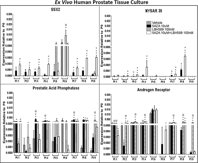 Figure 5: EMA treatment induces CTA expression in ex vivo human prostate tissue in a prostate biopsy drug culture model. Quantitative analysis of relative expression of SSX2, NYSAR35, prostatic acid phosphatase (PAP) and androgen receptor (AR) mRNA in PC tissue biopsies treated with EMAs. RNA was evaluated by qRT-PCR for expression relative to an internal control transcript (P0) following EMA treatment. qRT-PCR was performed using primers specific for each gene and was conducted in triplicate. Error bars represent the mean and SD. A missing bar indicates that there was no detectable signal. Comparison between groups was made with a 1-way ANOVA followed by post hoc analysis with the Tukey test. P < 0.05 compared with vehicle (*), 5AZA 10 μM (^), LBH589 100 nM (+), or 5AZA 10 μM + LBH589 100 nM (□) treatment.