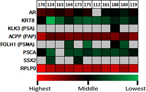 Figure 6: Quantitative analysis of expression of SSX2 and prostate-specific marker mRNA in circulating tumor cells. qRT-PCR was performed using primers specific for each gene, and the P0 housekeeping gene is included for reference. Expression was color scaled from red (highest) to black (middle) to green (lowest). Grey indicates that no relevant expression was detected.