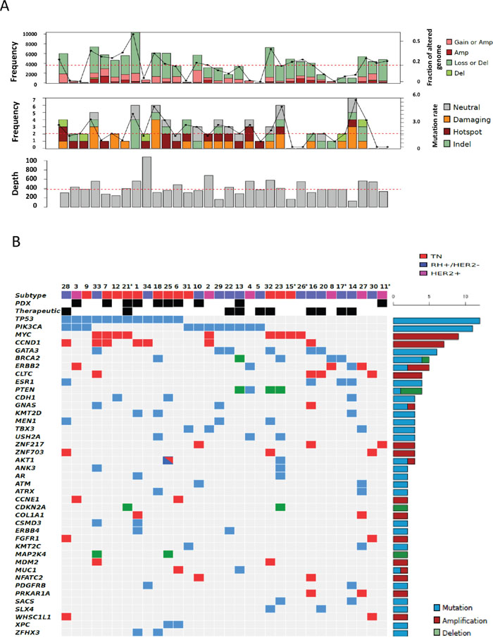 Figure 1: Distribution of molecular alterations identified by CGH arrays and NGS in all 32 samples. A. Upper, mid and lower panels indicate the percentage of altered genomes, the mutation rate and the depth of sequencing for each sample, respectively (dot lines indicate mean percentage of altered genome, median mutation rate and median depth of sequencing, respectively). Gain, amplification, loss and deletion as well as neutral, damaging, hot spot and indel mutations were defined as indicated in the material and methods section. B. The distribution of molecular alterations (blue, mutation; red, amplification; green, deletion) was shown by decreasing frequency across samples (unique and anonymized patient number). Only alterations present in more than 1 sample are shown. Sample subtypes (HR-positive/HER2-negative, blue; HER2-positive, pink; triple-negative, red) are indicated. Patients with PDX engraftment (“PDX”) and genomic-driven treatment (therapeutic) are also shown. Asterisks indicate patients without germline sequencing.