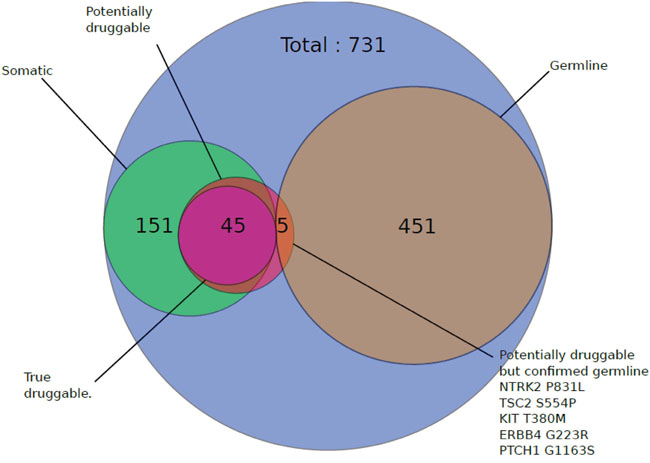 Figure 2: Impact of germline sequencing on the number of retained mutations. Patients with available normal samples (N=27) were subjected to constitutional sequencing and somatic mutations were identified as indicated in the Material and methods section. Results are shown on a Venn diagram.