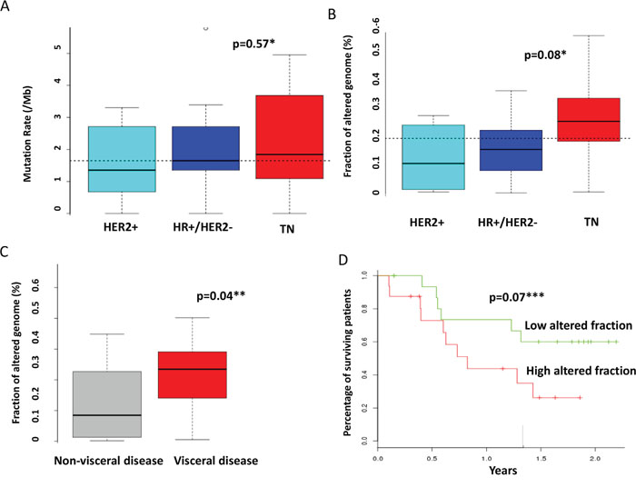 Figure 3: Correlations between molecular alterations and clinical features. The mutation rate A. and the fraction of altered genome B. were calculated as indicated in the material and method section and compared across molecular subtypes. C. The fraction of altered genome was compared according to the presence of visceral or non-visceral metastases. D. Overall survival was compared according to the fraction of altered genome. The median value of the overall population (0.2) was selected as threshold. * ANOVA ** student’s t-test *** Log-rank test.