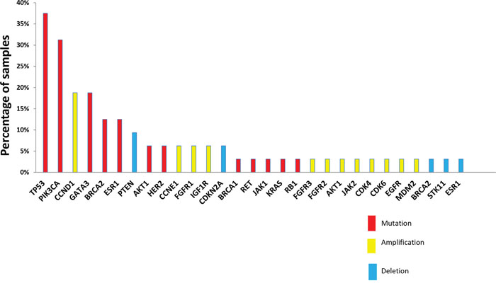 The most frequent actionable alterations were TP53 (12 of 32 patients analyzed, 37%), PIK3CA (10 patients, 31%; one additional PIK3CA somatic mutation was not retained as actionable since it did not involve kinase domain), GATA3 (6 patients, 18%), BRCA2 (4 patients, including 2 constitutional mutations, 12%), ESR1 (4 patients, 12%) mutations, and CCND1 amplifications (6 patients, 18%). Other actionable genomic alterations were identified in three or fewer cases (Figure 4).