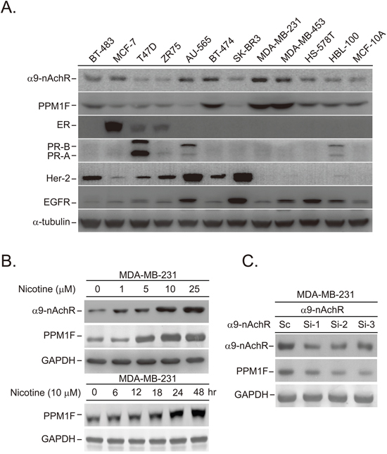 To examine protein expression, we harvested human breast tumor cells for Western blotting analysis as previously described [21]. The following antibodies were purchased from Cell Signaling Technology (Beverly, MA, USA): anti-EGFR (#9922) and anti-BAX (#2772). The following antibodies were purchased from Santa Cruz Co. (CA, USA): anti-ER-α (sc-543), anti-HER2 (sc-284), anti-PR (sc-538), anti-PARP-1/2 (sc-7150), goat anti-rabbit IgG-HRP (sc-2004), anti-GAPDH, (sc-32233), anti-phosphorylated p53 (sc-18079-R), and goat anti-mouse IgG-HRP (sc-2005). The following antibodies were purchased from Abcam Inc. (Cambridge, MA): anti-α-tubulin (ab4074), anti-α9-nAChR, anti-p53 [DO-1] (ab1101), anti-phosphorylated BAX (Ser-184) (ab111391), anti-PPM1F (ab156222) and anti-cytochrome C [7H8.2C12] (ab13575).