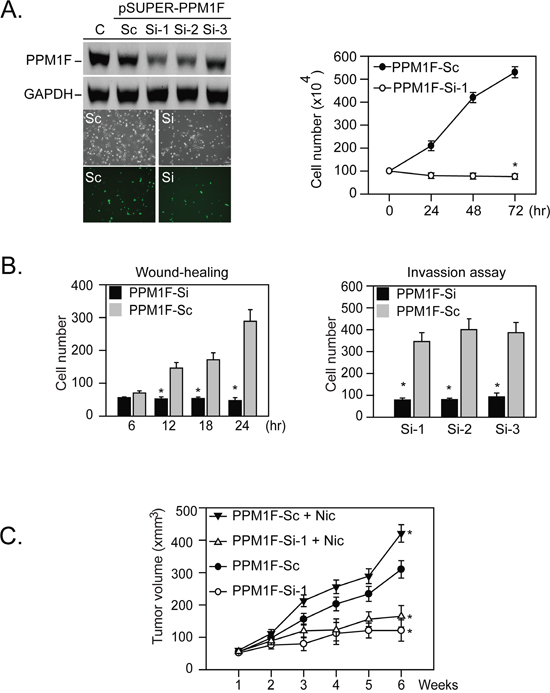 To test whether the nicotine-induced mitochondrial translocation of PPM1F (Figure 4A and 4B) allows PPM1F to bind to and dephosphorylate pro-apoptotic proteins (such as BAX), immunoprecipitation was performed to evaluate the complex formation between PPM1F and the active form of BAX, p-BAX (Ser-184). Complex formation between PPM1F and total BAX protein increased in nicotine-treated cells (Figure 4C, upper right). However, the complex formation between PPM1F and p-BAX (Ser-184) decreased in the nicotine-treated cells (Figure 4C, right). These results suggested that the nicotine-induced translocation of PPM1F to the mitochondria triggers the binding of PPM1F to p-BAX (Ser-184), which then promotes p-BAX (Ser-184) dephosphorylation and attenuates BAX-induced apoptosis. All these results suggested that the nicotine-induced translocation of PPM1F to either the mitochondria or the nucleus inactivates pro-apoptotic proteins (such as p53 and BAX) and thus stimulates oncogenesis.