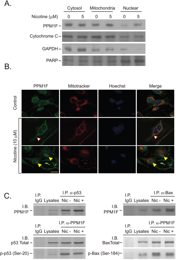 Figure 4: Nicotine induces PPM1F nuclear and mitochondrial translocation and complex formation with p53 and BAX. A. MDA-MB-231 cells were treated with nicotine (5 μM) for 24 hours. The nuclear and mitochondrial lysates were isolated according to the manufacturer’s instructions, and the protein levels of PPM1F and markers such as PARP, cytochrome C and GAPDH were determined by Western blotting of equal amounts of protein. B. MDA-MB-231 cells were stained for PPM1F (FITC-labeled), a mitochondrion-specific marker (MitoTracker), and Hoechst dye to determine nuclear localization. The intracellular localization of PPM1F was observed by confocal microscopy, as described in the Materials and Methods. (Scale bar = 25 μm) C. MDA-MB-231 cells were treated with or without nicotine (10 μM) for 24 hours (lanes 3-4). Cells subjected to various treatment regimens were assessed for the presence of protein-protein interactions among PPM1F, p53 and BAX. For each sample, PPM1F-associated p-p53 (Ser-20) or p-BAX (Ser-184) was immunoprecipitated (I.P.) from 200 μg of lysate as described above, and the presence of PPM1F, p53, p-p53 (Ser-20), BAX, or p-BAX (Ser-184) in the immunoprecipitated material was determined by Western blotting (or immunoblotting, I.B.) with specific antibodies.
