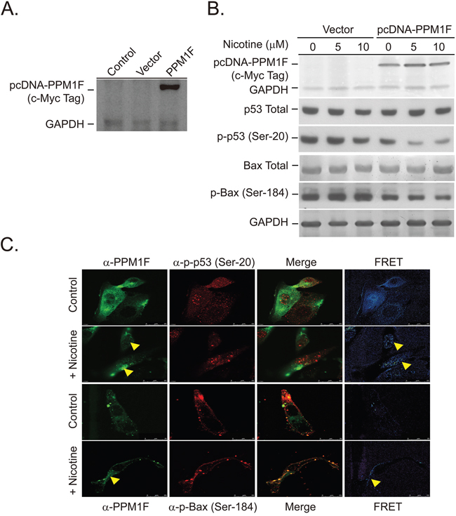To test this hypothesis, we established stable PPM1F-overexpressing cells using a pcDNA3.1TM/myc-His vector. PPM1F was expressed as a recombinant protein along with a His Tag (6x) and a c-Myc-Epitope-Tag (Figure 5A). The recombinant PPM1F protein was detected with a monoclonal antibody specific to c-Myc-Epitope-Tag-PPM1F (Figure 5A and 5B). Both the PPM1F-overexpressing and vector control cells were treated with nicotine (5 and 10 μM) for 24 hours (Figure 5B). We found that p-p53 (Ser-20) and p-BAX (Ser-184) were dephosphorylated in the nicotine-treated pcDNA3.1-PPM1F cells (Figure 5B, lane 4 vs. lanes 5 and 6). In addition, even without nicotine treatment, significant dephosphorylation of p-p53 (Ser-20) and p-BAX (Ser-184) was observed in PPM1F-overexpressing cells relative to vector control cells (Figure 5B, lane 1 vs. lane 4). To further confirm whether p-p53 (Ser-20) and p-BAX (Ser-184) were dephosphorylated by PPM1F through direct complex formation, pcDNA3.1-PPM1F cells were treated with nicotine (10 μM, 24 hours), and fluorescence resonance energy transfer (FRET) photobleaching was performed to detect PPM1F/p-p53 (Ser-20) and PPM1F/p-BAX (Ser-184) complex formation (Figure 5C). A significant FRET signal was detected in the nicotine-treated pcDNA3.1-PPM1F cells (Figure 5C, yellow arrowhead). These results explain the mechanisms underlying the higher PPM1F levels involved in inactivation of p53-mediated apoptosis pathway in breast tumor tissues from smokers compared to non-smokers.