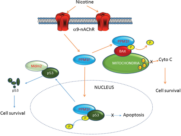 Figure 6: Schematic representation of the involvement of PPM1F in nicotine-induced breast cancer tumorigenesis. Higher PPM1F protein levels were detected in advanced-stage breast cancer tissues, as well as breast cancer tissues from patients with a smoking history. We demonstrated that knockdown of α9-nAChR also reduced PPM1F expression. In contrast, nicotine treatment induced PPM1F expression in MDA-MB-231 cells. We found that after nicotine treatment, PPM1F triggered the inactivation of both p-p53 and p-BAX by dephosphorylating them at specific sites. These results suggest that PPM1F could be downstream of α9-nAChR in nicotine-induced breast cancer formation, and could attenuate p-p53 (Ser-20)- and p-BAX (Ser-184)-induced pro-apoptotic pathways.