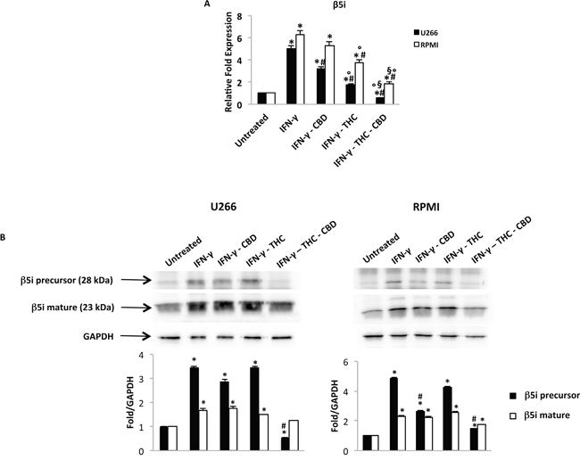 Figure 6: Regulation of the β5i subunit by THC and CBD in MM cell lines stimulated with IFN-γ. U266 and RPMI cells were treated with IFN-γ 100 U/ml for 24 h. Then cells were treated with THC (12.5 μM), CBD (12.5 μM) alone and in combination for additional 24 h. A. The β5i mRNA levels were determined by qRT-PCR. GAPDH was used for normalization. Data are expressed as relative fold with respect to vehicle treated cells used as the control. Data are expressed as mean ± SD. *p<0.01 vs untreated; #p<0.01 vs IFN-γ; °p<0.01 vs IFN-γ-CBD; §p<0.05 vs IFN-γ-THC. B. The levels of the precursor and mature form of the β5i subunit were analysed by western blot. GAPDH was used as the loading control. Blots are representative of three separate experiments. Bars represent the densitometric analysis. *p<0.05 vs untreated cells; #p<0.05 vs IFN-γ treated cells.