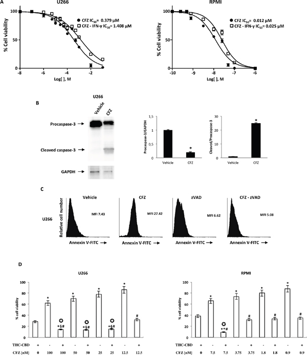 Figure 7: The effect of CFZ alone or in combination with THC-CBD on cell viability. A. U266 and RPMI cell lines were cultured for 72 h with different doses of CFZ in the presence or absence of IFN-γ (100 U/ml). Cell viability was determined by the MTT assay. Data shown are expressed as mean ± SE of three separate experiments. B. Lysates from the U266 cell line treated with CFZ 100 nM for 72 h, were analyzed for caspase-3 protein level by western blot analysis. GAPDH protein levels were evaluated as the loading control. Blots are representative of three separate experiments. Bars represent the densitometric analysis. *p<0.01 vs vehicle treated cells. C. U266 cell lines were pre-treated with 5 mM zVAD for one h and then treated with 100 nM CFZ for 72 h. The percentage of Annexin V positive cells were determined by FACS analysis. Histograms are representative of one of three separate experiments. MFI, mean fluorescence intensity. D. U266 and RPMI cell lines were treated with THC-CBD in combination with different doses of CFZ. Cell viability was evaluated by the MTT assay. Data shown are expressed as mean ± SD of three separate experiments. *p<0.01 vs THC-CBD treated cells; #p<0.01 vs CFZ alone; §p<0.01 vs THC-CBD-CFZ vs THC-CBD-CFZ (12.5 nM); °p<0.01 vs THC-CBD-CFZ (7.5 nM) vs THC-CBD-CFZ (3.75, 1.8, 0.9 nM). ✪ indicates synergism (C<1).