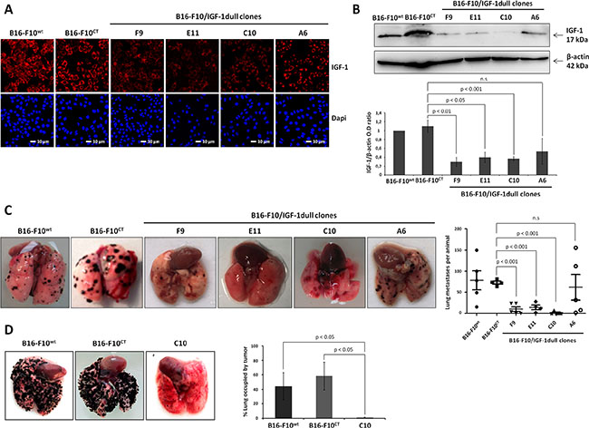 Figure 1: IGF-1 downregulation impairs lung colony formation by B16-F10 melanoma cells in immunocompetent and immunodeficient mice. (A) IGF-1 levels were analyzed in four IGF-1dull clones (A6, C10, E11, F9), the control B16-F10CT and the parental B16-F10WT cells, by confocal microscopy. Red, IGF-1; Blue, nuclei stained with DAPI. The scale bar represents 10 μm. (B) IGF-1 levels in the various cell lines were analyzed by immunoblotting. β-actin was used as a loading control. Graphs show quantification of the immunoblot signals (IGF-1/β-actin). Data are represented as the mean ± standard error of mean (SEM) for three independent determinations. n.s., not significant, p < 0.05 p < 0.01, p < 0.001 versus B16-F10CT cells. (C–D) Lung colony formation. Groups of C57BL/6 and NSG mice received 1 × 105 cells via injection into the retro-orbital sinus (day 0). Fifteen days after inoculation with cells, the lungs were excised and nodule development was analyzed. Representative images of the lung nodules are shown. Horizontal bars represent the mean number of lung colonies ± SEM per C57BL/6 mouse. Clones E11 (14.5 ± 5.3 nodules), F9 (10.4 ± 5.6 nodules) and C10 (1.6 ± 1.6 nodules) had a significantly lower level of lung colony formation (p < 0.001, n = 5) than clone A6 (62 ± 30.6 nodules), B16-F10CT (73.8 ± 19.2 nodules) and B16-F10WT (73 ± 3.6 nodules) cells. n.s., not significant. In NSG mice, nodule development was quantified as the percentage of the lung occupied by tumors. Images of representative tumors are displayed for each in vivo experiment. The C10 clone formed lung colonies significantly less efficiently than B16-F10CT and B16-F10WT cells (1 ± 0.6% versus 58.3 ± 23 % and 44.1 ± 18.6% of the lung occupied by tumors, respectively, p < 0.05, n = 3).