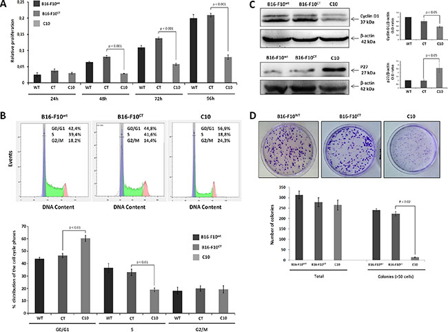 Figure 2: IGF-1 downregulation impairs cell proliferation. (A) B16-F10 cell proliferation. B16-F10WT, B16-F10CT and C10 cells were plated in 96-well plates and cell proliferation was assessed for 96 h in the MTT assay. The data presented are the mean (±SEM) of quadruplicate experiments. C10 had a lower proliferation rate than control cells, from 48 h onwards (0.08 ± 00.7 versus 0.002 ± 0.012 OD values, p < 0.001, n = 4). (B) Cell cycle analysis. After staining with propidium iodide, the distribution of the cells between the G0/G1, S and G2/M phases was determined by flow cytometry. Top, Representative cell cycle plots from one experiment are shown. The distribution and percentage of cells in the G0/G1, S and G2/M phases of the cell cycle are indicated at the top right of each histogram. Bottom, Data are represented as means ± SEM. IGF-1 downregulation resulted in a lower percentage of cells in S-phase (18.9±1.4%) for C10 cells than for B16-F10WT (36.5 ± 3.7%) and B16-F10CT cells (33.0 ± 2.5%, p < 0.001, n = 4), and a higher percentage of cells in G0/G1 phase in C10 cells (60.4% +/–2.3) than in B16-F10WT (43.9 ± 1.0%) and B16-F10CT cells (46.4 ± 1.7%, p < 0.001, n = 4). (C) Quantification of cyclin D1 and p27 protein levels in B16-F10WT, B16-F10CT and C10 cells. Graphs represent the quantification of immunoblot signals, corresponding to the cyclin D1/β-actin and p27/β-actin ratio. Data are represented as means ± SEM for three independent determinations. (D) Clonogenic assay. B16-F10WT, B16-F10CT and C10 cells were assessed for clonogenic potential. The data presented are the means (±SEM) of quintuplet experiments. C10 colonies were significantly smaller than the colonies for control and parental cells (14 ± 2 colonies with a diameter > 75 μm for the C10 clone versus 241 ± 6 and 223 ± 10 for B16-F10WT and B16-F10CT, respectively, p < 0.02, n = 5).