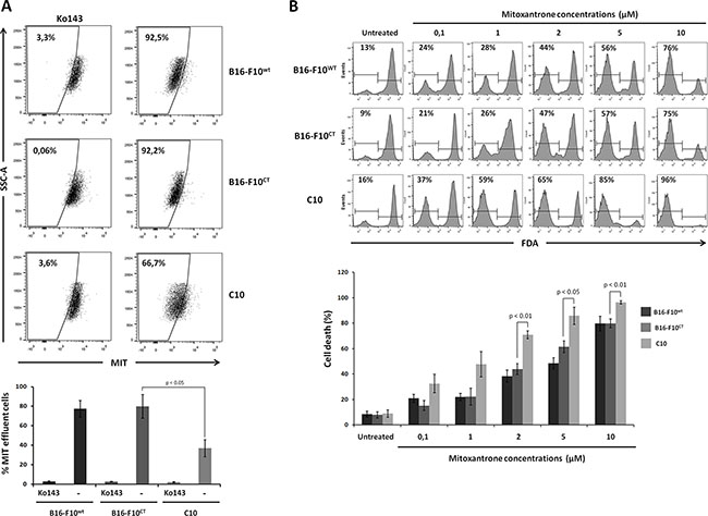 Figure 7: IGF-1 downregulation sensitizes B16-F10 cells to mitoxantrone. (A) Analysis of the intracellular accumulation of MIT in B16-F10WT, B16-F10CT and C10 cells. Mitoxantrone efflux and ABCG2 activity were determined by flow cytometry measurements of mitoxantrone accumulation in the presence and absence of the ABCG2 inhibitor Ko143 (1 μM). Top, Seven independent experiments were performed, and the results of a single representative experiment are shown here. Percentages of cells displaying MIT efflux are shown at the top left of each histogram. Bottom, Data are shown as means ± SEM. C10 cells were significantly less able to exclude MIT (36.9 ± 9.0%) than B16-F10WT and B16-F10CT cells (77.5 ± 21.2% and 79.9 ± 15.1%, respectively, p < 0.05, n = 7). (B) Cell viability. Cells were treated with different concentrations of mitoxantrone (0.1 to 10 μM) and cell viability was determined at 48 h, in the FDA assay. Top The panel depicts one of four experiments. Percentages of FDA-negative (dead) cells are shown at the top left of each histogram. Bottom, Data are shown as means ± SEM. B16-F10WT and B16-F10CT cells were consistently found to be more resistant to MIT than the C10 clone, from the dose of 2 μM MIT upwards, with 70.8 ± 3.0% cell death for the C10 clone versus 38.3 ± 4.7% and 43.8 ± 4.25% cell death for B16-F10WT and B16-F10CT cells, respectively, p < 0.01, n = 4.