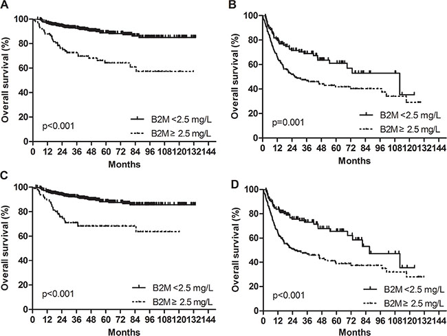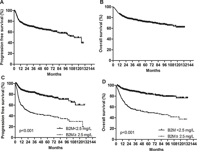 Beta-2 microglobulin is synthesized in all nucleated cells and forms the light chain subunit of the major histocompatibility complex class I antigen [9, 10]. Free soluble beta-2 microglobulin can be detected in blood, urine, and cerebrospinal fluid, following its release from the cell surface or cytoplasm [11]. Specifically, measurement of serum beta-2 microglobulin is essential for baseline work up of multiple myeloma and follicular lymphoma patients [12–14]. Previous studies showed elevated serum beta-2 microglobulin was an independent poor prognostic factor in patients with DLBCL treated with CHOP or CHOP-like regimens [15, 16]. However, the prognostic value of beta-2 microglobulin in patients with DLBCL treated with rituximab containing regimens has not yet been fully investigated.