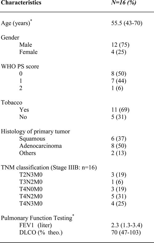 A total of 16 (/22 screened) patients with stage IIIB NSCLC were enrolled in 4 French centers between 09/2004 and 01/2006. Due to a low accrual rate in this study, the sample size was not reached and the study was prematurely closed.