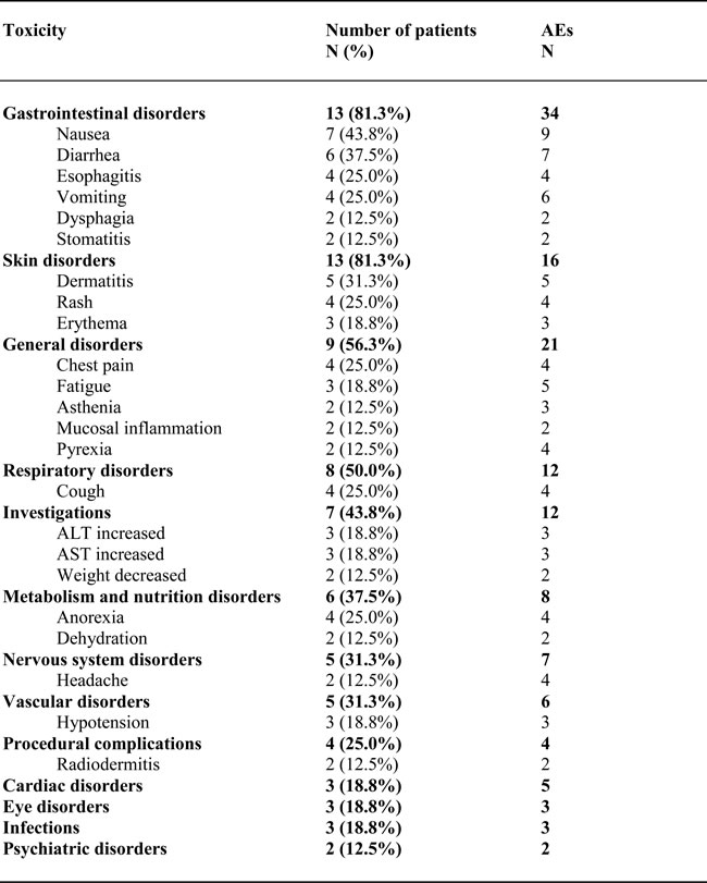 Table 2: Most common AEs (>10 % of patients overall) observed in 16 patients during the combination of gefitinib and radiotherapy (weeks 1-11)