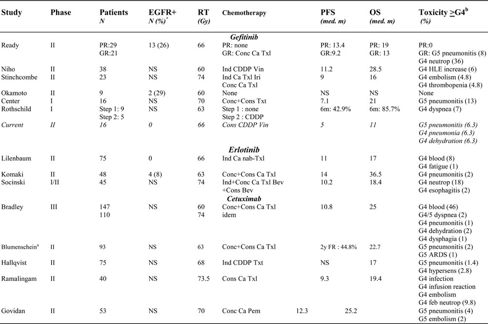 The standard treatment for locally advanced unresectable non-small cell lung cancer (NSCLC) is the association of conventional chemotherapy (platinum based doublets) and radiotherapy [1-3]. Outcomes of locally advanced NSCLC however remain poor and new efficient, safe, and more specific treatments are needed. In the last decades, an enhanced understanding of the NSCLC oncogenic molecular pathways has led to the expansion of individualized targeted therapies. Molecular anomalies include KRAS mutation and / or mutation and overexpression of epidermal growth factor receptor (EGFR). Mutations in the EGFR tyrosine kinase are observed in approximately in 15% to 62% of patients and are predictors of responsiveness to EGFR tyrosine kinase inhibitors (TKIs) [4-7]. In the metastatic setting, several EGFR TKIs (erlotinib, gefitinib, afatinib) prolong progression-free survival as compared with platinum based chemotherapy doublets in patients with EGFR mutated lung cancer [5].