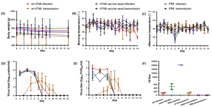 We weighed the three infection groups before infection and again at 2, 4, 6, 8, 10, 12 and 14 dpi, and the three transmission groups before caging together with the infection groups and again on days 2, 4, 6, 8, 10, 12 and 14 after caging together. Total body weight throughout the course of infection (14 days) for each group is shown in Figure 1A. A trend towards a reduction in weight at 1 dpi was observed in all three infection groups and continued until day 8 dpi before reaching a plateau. There was no significant decrease in body weights in the H7N9 vaccine seed virus transmission group or PR8 transmission group. Ferrets in the wt H7N9 virus transmission group started losing weight at day 2 after caging together, with weights remaining unchanged at days 4, 6 and 8, and then increasing. No significant differences in body weight (p > 0.05) were observed across the three infection groups or the three transmission groups.