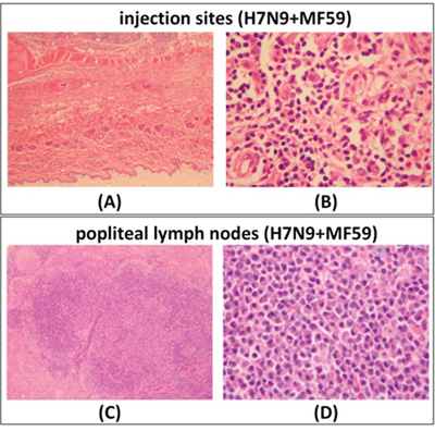 Figure 5: At day 57 (recovery phase) of the repeated dose toxicity test, H&E staining was performed of intramuscular injection sites and popliteal lymph nodes from rats treated with H7N9 vaccine with MF59 adjuvant. Intramuscular injection sites, magnification ×40 A., ×400 B. Popliteal lymph nodes magnification ×40 C., ×200 D.