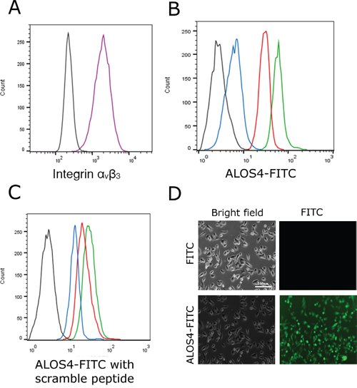 Figure 1: Binding of ALOS4-FITC conjugate to WM-266-4 human metastatic melanoma cells in vitro. A. Expression of integrin αvβ3 in WM-266-4 cells was evaluated by FACS analysis using FITC-conjugated integrin αvβ3 antibody (black-control cells w/o an antibody, purple-cells incubated with FITC-conjugated integrin αvβ3 antibody). B. Binding of ALOS4-FITC to the WM-266-4 cells at concentrations of 1μM (blue), 5μM (red) and 20μM (green). Auto-fluorescence of the cells is marked by a black line. C. Binding of 10 μM of ALOS4-FITC in the presence of the ''scrambled” peptide P1 at concentrations of 1μM (blue), 5μM (red) and 20μM (green). Auto-fluorescence of the cells is marked by a black line. D. Fluorescence of live WM-266-4 cells following incubation with 10 μM of FITC or ALOS4-FITC. Scale bar: 100 μm.