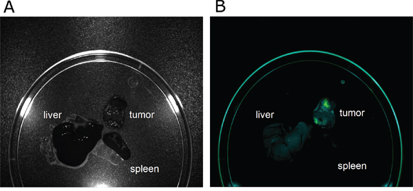 Figure 2: Tumor-specific retention of ALOS4-FITC. WM-266-4 cells were injected subcutaneously into nude mice to induce a tumor. Mice bearing a 100 mm3 tumor were intravenously injected with ALOS4-FITC. 3 hours and 24 hours post injection, the tumor, the spleen and the liver were excised and evaluated for accumulation of ALOS4-FITC by Maestro™ In-Vivo Fluorescence Imaging System. The results of ALOS4-FITC accumulation after exposure for 3 hours and 24 hours were similar, therefore only the 24 hour time point is presented. A. Image of the excised organs. B. Unmixed composite image of ALOS4-FITC fluorescence.