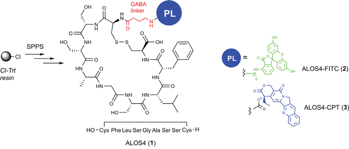 Figure 3: Schematic representation of synthesis of ALOS4 and its fusion to FITC and CPT. All peptides were synthesized using solid phase organic synthesis (SPOS). Conjugations of FITC and CPT done via GABA linker.